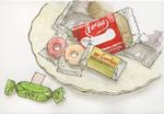 今回は用意してもらったカラフルな輸入物のお菓子と持参した小皿がモチーフ。